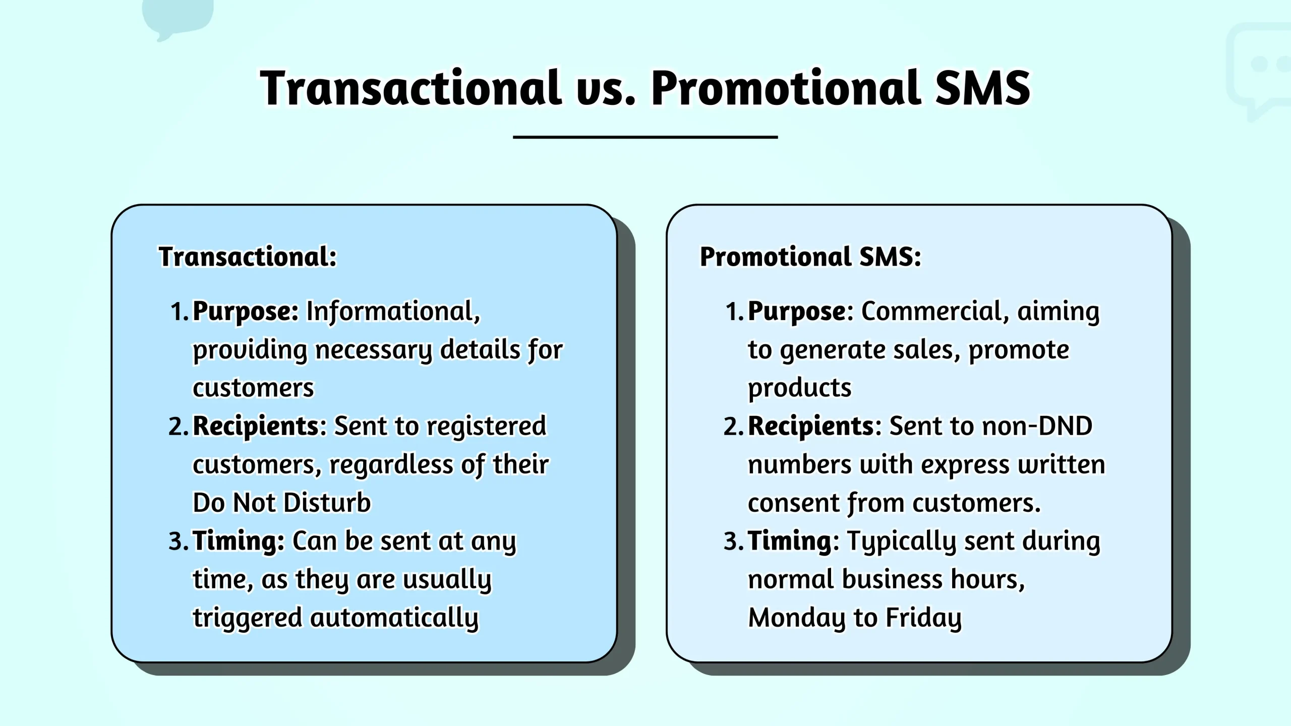 Promotional SMS are for marketing and have time restrictions. Transactional SMS are for essential info like OTPs and can be sent anytime.
